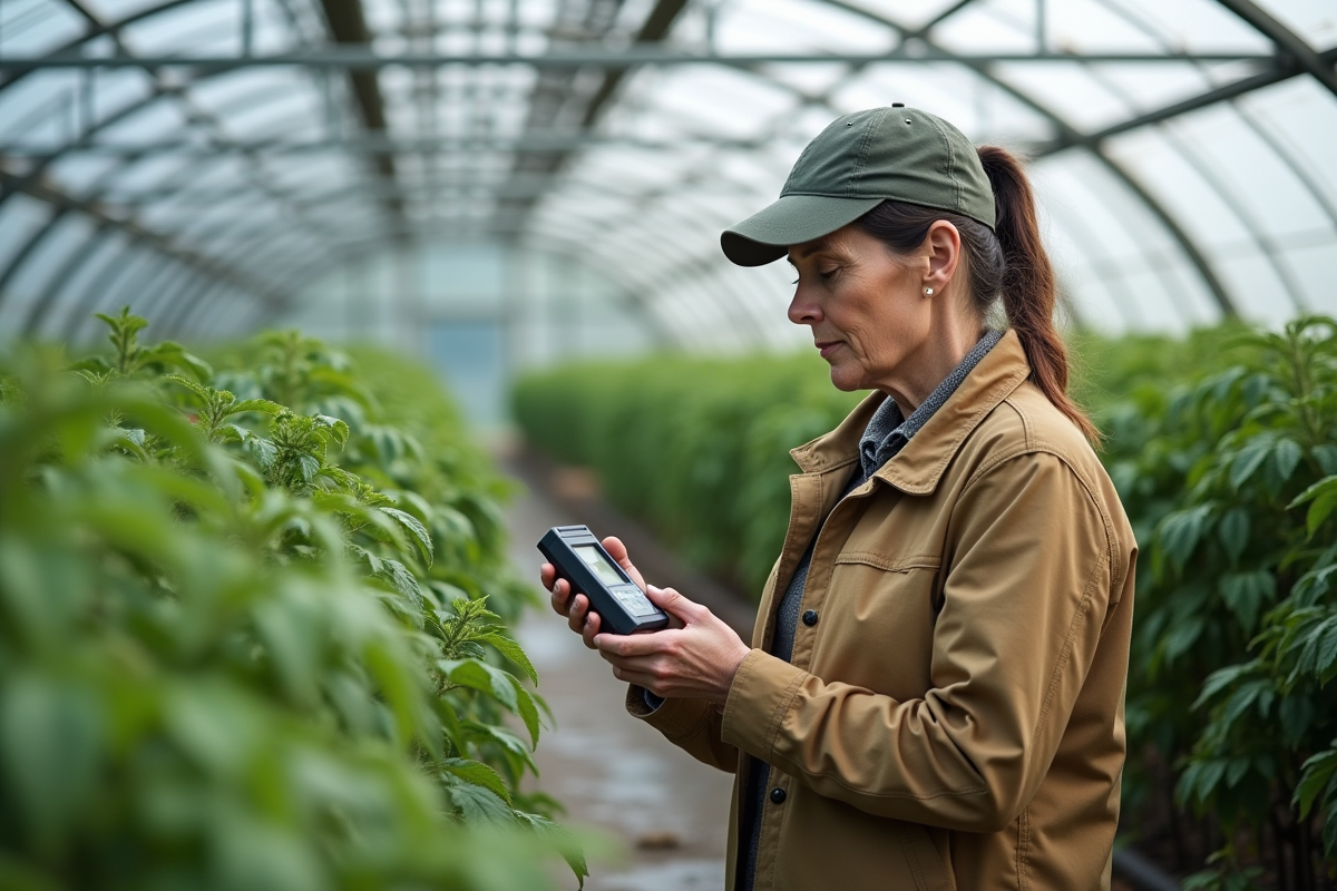 Femme vérifiant un hygromètre dans une serre moderne